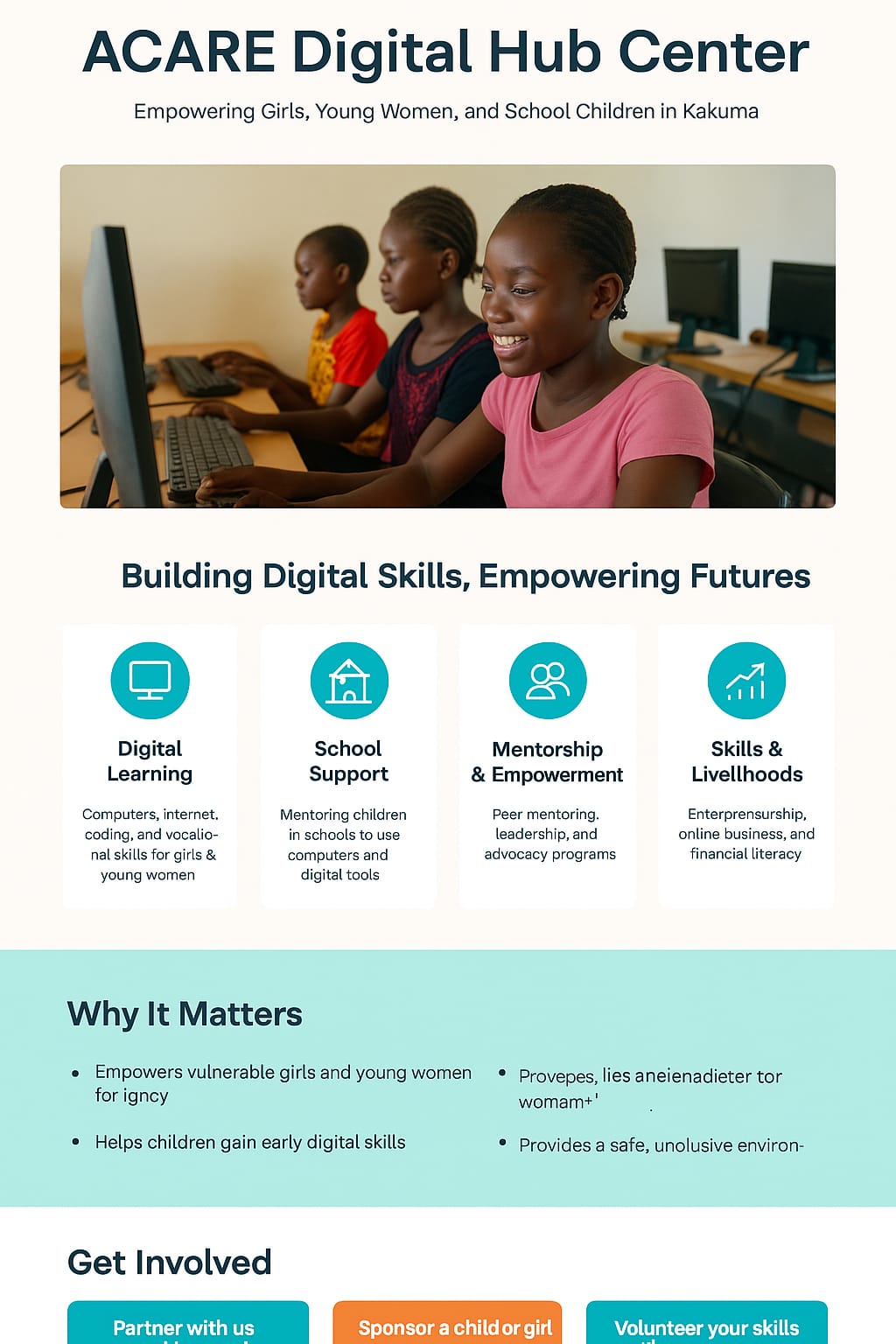 The ACARE Digital Hub is an impactful initiative developed by Acare Organization, dedicated to improving the lives of girls, young women, and vulnerable children in Kakuma Refugee Camp. This program aims to address the critical need for digital literacy and mentorship opportunities, particularly in underserved refugee communities. Acare Organization seeks to alleviate the challenges faced by its beneficiaries by providing them with comprehensive digital learning, mentorship programs, and safe spaces for growth, ultimately transforming their lives and empowering them with essential skills for a brighter future. This initiative has positively impacted thousands of girls, young women, and vulnerable children through Enhanced Digital Literacy, Educational Advancement through coding and e-learning, Leadership Development via peer mentorship, and Economic Empowerment through entrepreneurship and financial literacy training.